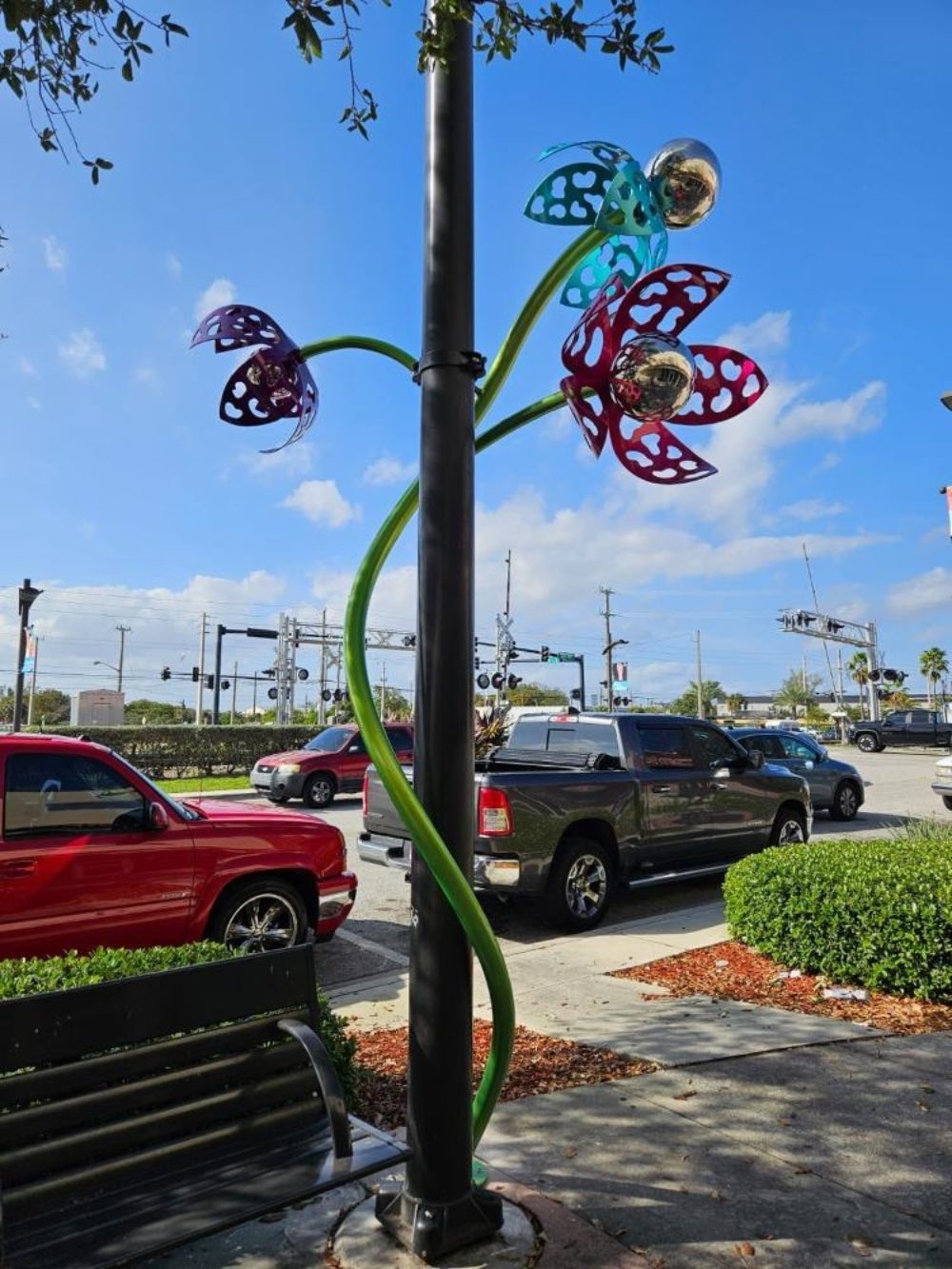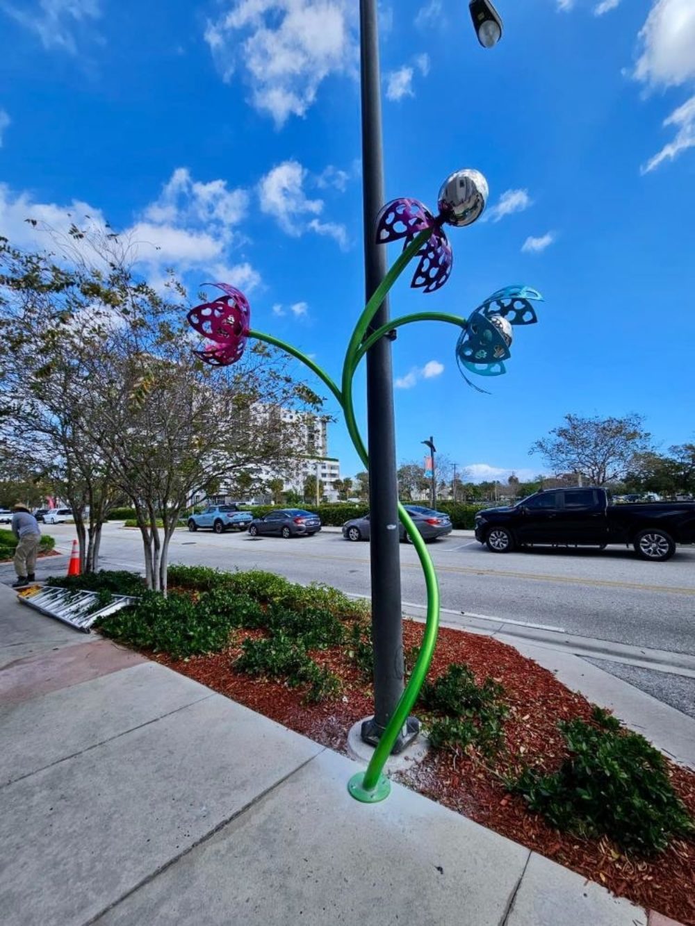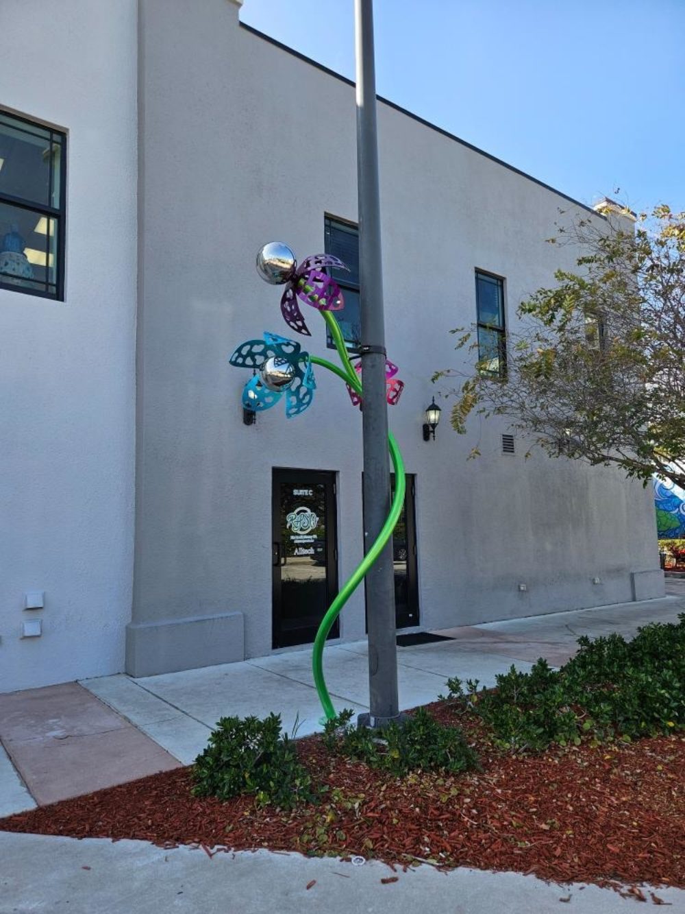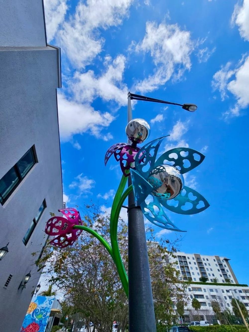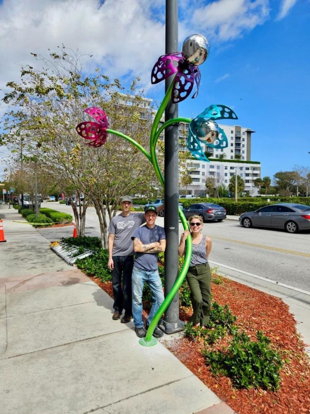 Space Plants first appeared in Portland Oregon in 2000. In 2024, a seed ended up traversing the US and ended up in Pompano Beach! The Plant seems to have evolved slightly along the way, resulting in the first Galactic Bloom which as installed in November 2024. Galactic Bloom was so well received that the City commissioned two additional Space Plants similar in style, but with their own new unique twists. The original Plant is installed at 11 NE 1st Street. The two additional Space Plants are installed at 61 NE 1st Avenue and N. Flagler Avenue and 2nd Street. Space Plant stands about 12 feet tall and has 4 blossoms at various heights and is made out of stainless steel. All of the Space Plants are 12 feet tall and made our of stainless steel.