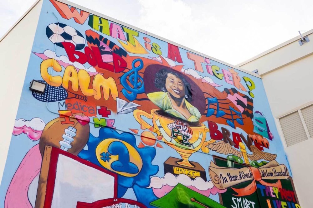 A tiger goes by many names, embodies many traits and all the while the majesty of this creature is appreciated and recognized by all. When creating this mural artist Andrew Hayes was struck with the idea of community and how a solitary animal could mean so much to the community at large. In Hayes’ early interviews with students, parents, employees, and alumni and throughout the process one sentiment was clear and ever present, an unshakeable pride and inherited will carried by all who call Blanche Ely High School home. For that reason, Hayes let the students take the wheel and control the course of action allowing me to serve as a curator of their community message. Ironically, his question to the students became the title for this piece and the mural a visual answer. It is Hayes honor to share his hand in being the mirror for a community that serendipitously shares his own motto of freedom within artwork as an anagram in its name, BE. This mural is a testament to the authenticity of both the students and alumni. It is Hayes’ belief that people live happier and more fulfilled lives when they are free to be themselves and for that reason they should be just that, themselves. As you gaze upon this mural it is Hayes’ hope, to capture the spirit of its composers and transitively the founder and first principal, Mrs. Blanche Ely. And as always Be Bold, Be Creative, Be You.
